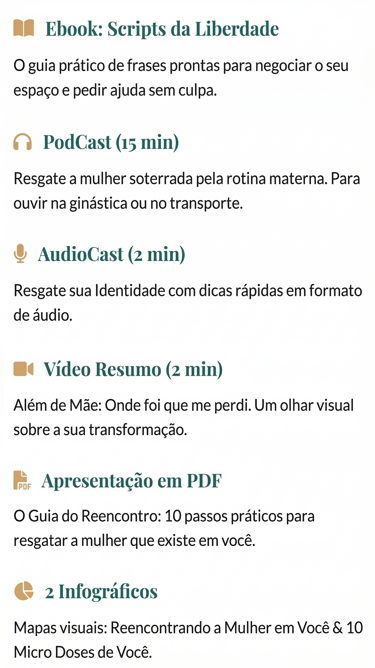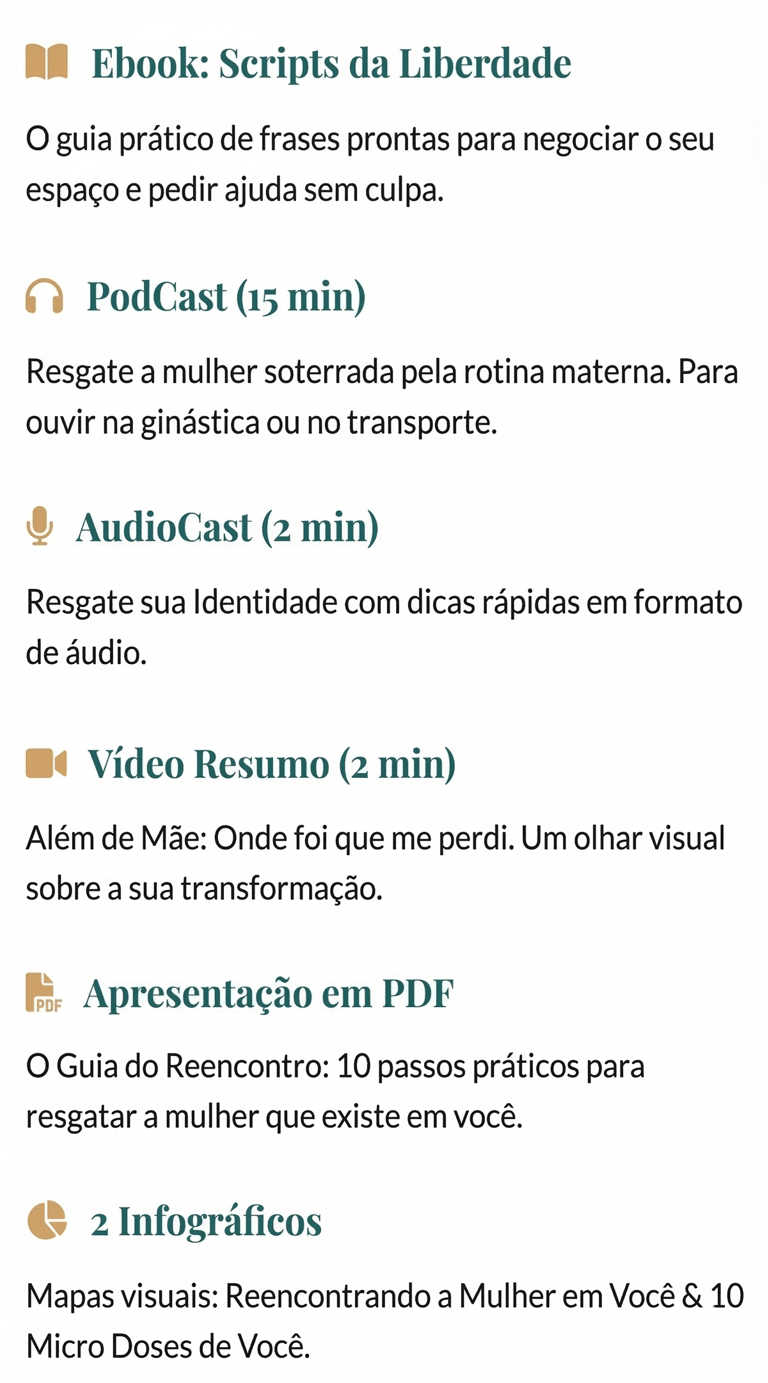Adquira agora o Guia Digital "Além de Mãe" com acesso imediato e receba todos os 6 bônus exclusivos.